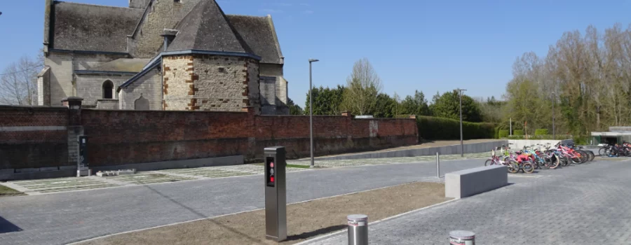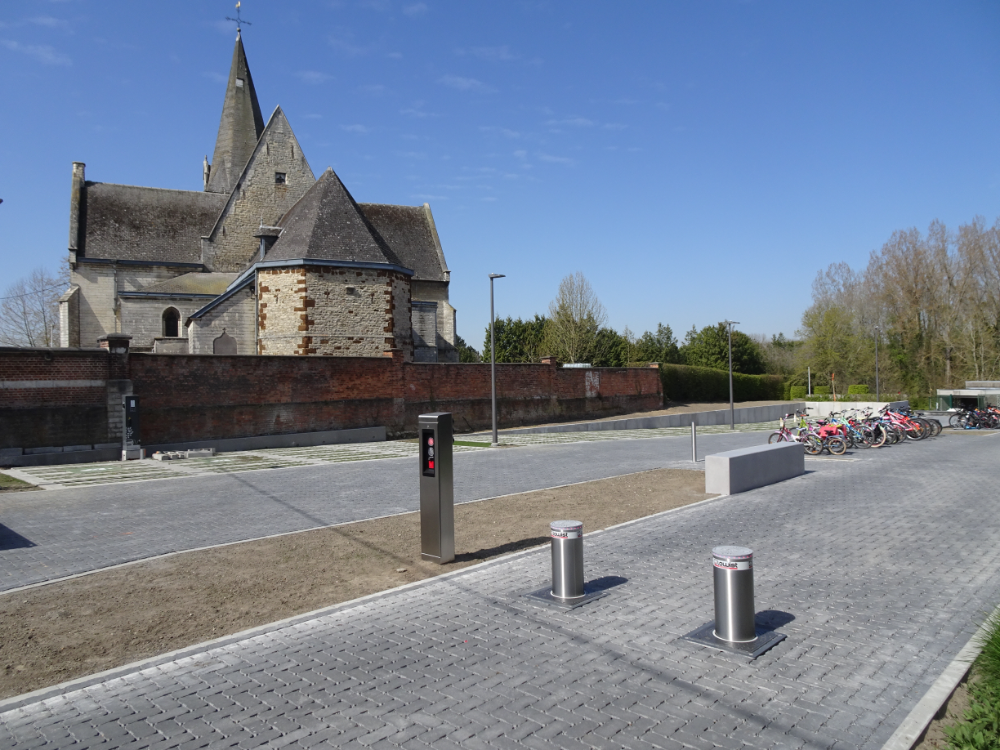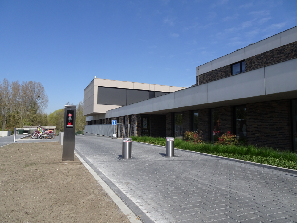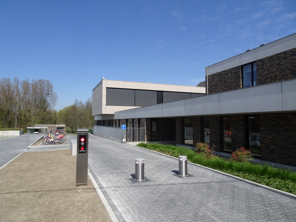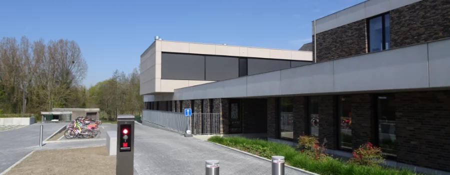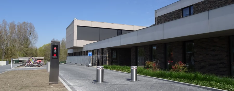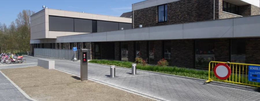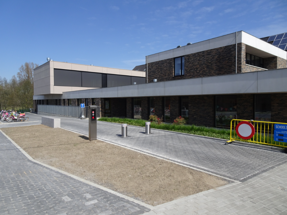 Samen met de omgevingsaanleg plaatsten we verzinkbare palen aan de toegangsweg naar de gemeenteschool. Zo kunnen de leerlingen zich veilig van en naar de toegangspoort bewegen, te voet of met de fiets richting de aanpalende stalling.